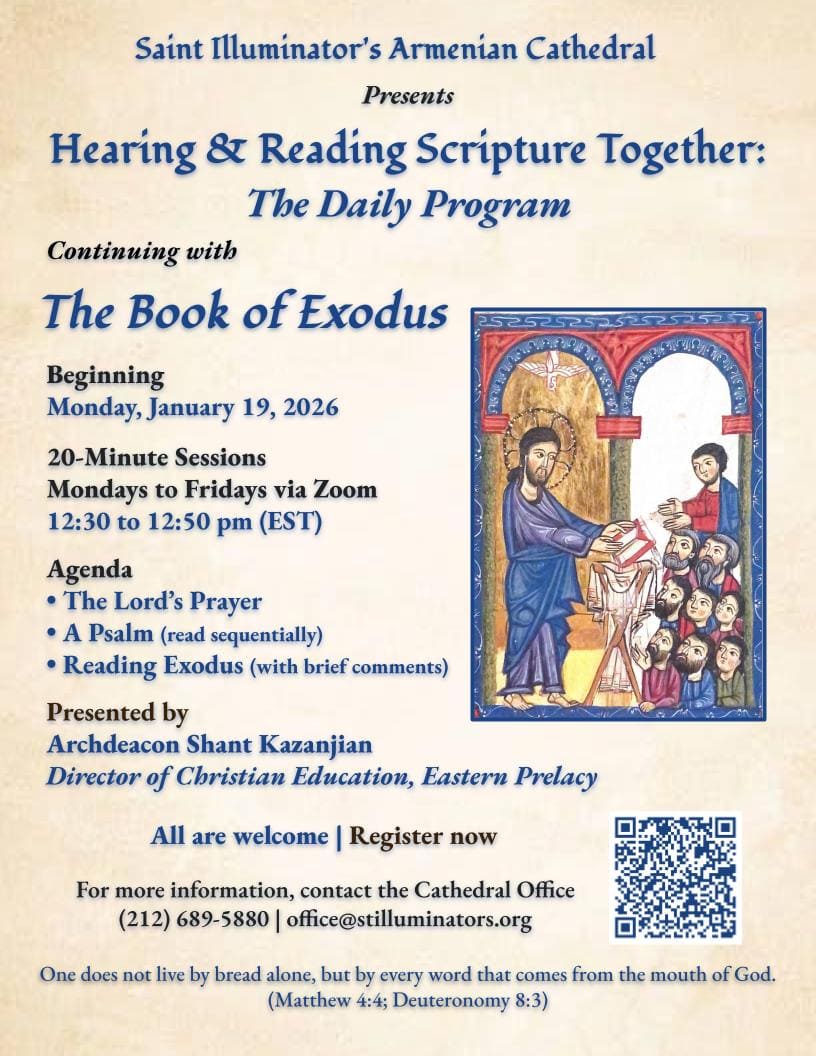 Անցեալ շաբաթ, Ս. Լուսաւորիչ Մայր Եկեղեցին եզրափակեց առաջին բաժինը նոր նախաձեռնութեան մը, որ ուղղուած է աստուածաշնչական գրագիտութեան սատարել հաւատացեալներուն մէջ։ Հակիրճ ու կարգապահ ամէնօրեայ Աստուածաշունչի ընթերցումները տեղի կ՚ունենան Երկուշաբթիէն մինչեւ Ուրբաթ։ Այս առաջին բաժինը նուիրուած էր Ծննդոց գիրքին, մասնակցութեամբ՝ 30 հոգիի, եւ ղեկավարութեամբ Բարշ. Շանթ Ա. Սրկ. Գազանճեանի՝ Ազգային Առաջնորդարանի Քրիստոնէական Դաստիարակութեան բաժանմուքի վարիչ տնօրէն։