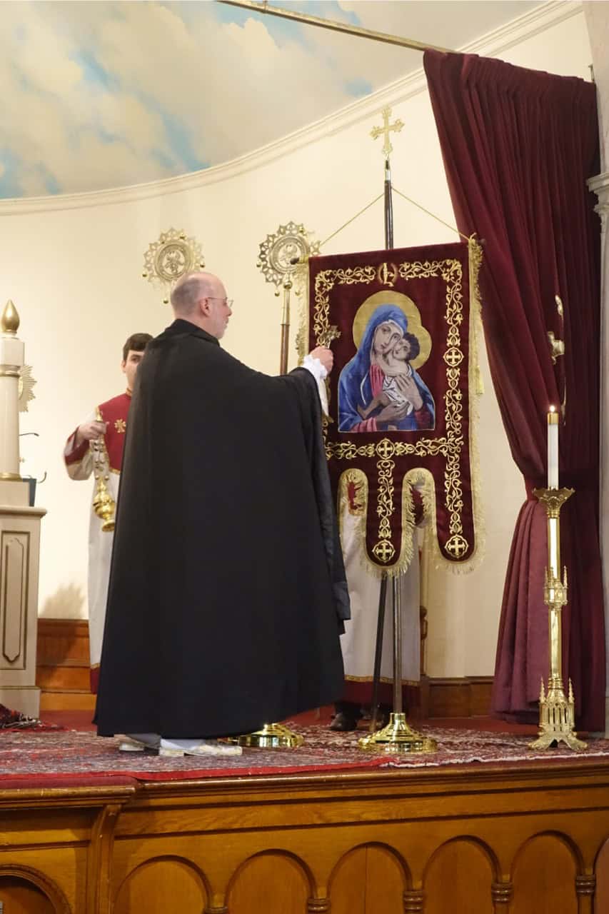 Nearing the end of the service, His Eminence offered a special blessing of a processional flag, donated by the Tikoian family, two kshotz (liturgical fan) donated by the Nalbandian family, and new lanterns donated by the Khatchadourian family. Archbishop Anoushavan explained that it is a tradition in the church to bless any new item that is going to be used on the altar.
