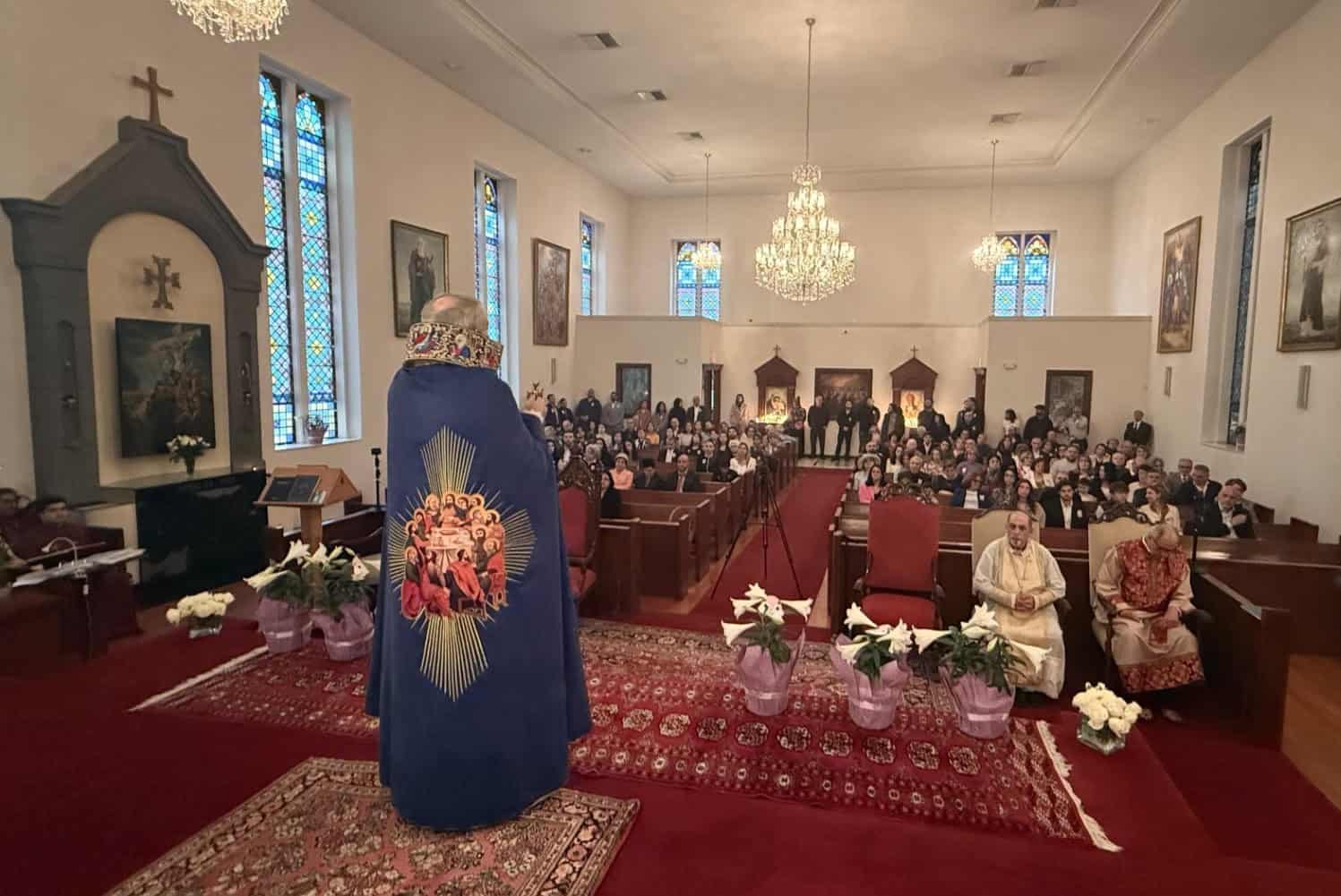 Շաբաթ երեկոյեան, Սրբազան Հայրը մասնակցեցաւ Ճրագալոյցի Ս. Պատարագին Ս. Սարգիս եկեղեցւոյ մէջ (Տակլըսթըն, Նիւ Եորք), որ մատոյց Արժպ. Տ. Նարեկ Ա. Քհն. Թրթռեան՝ եկեղեցւոյ հոգեւոր հովիւը։ Աւարտին, հրաւիրեց բոլոր ներկաները անդադար աղօթելու, որ Հօր Աստուծոյ կամքը կատարուի ինչպէս երկնքի մէջ, նաեւ երկրի վրայ, որպէսզի փոթորկալից ներկայ աշխարհի մէջ խաղաղութիւնը վերահաստատուի։
