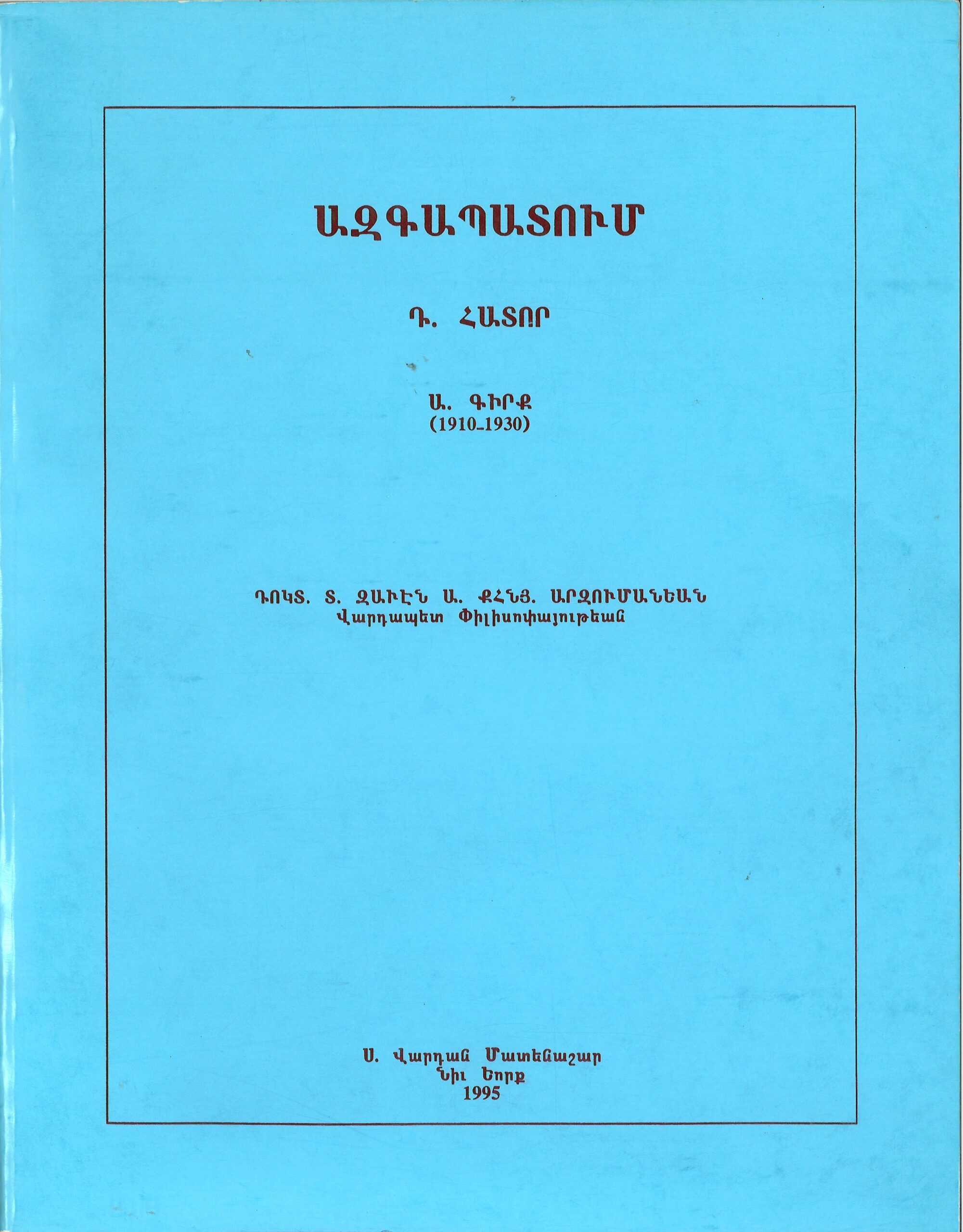 Ազգապատում, Դ․ Հատոր Ա․ Գիրք (1910-1930), Դոկտ․ Տ․ Զաւէն Ա․ Քհնյ․ Արզումանեան (թղթակազմ)